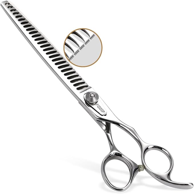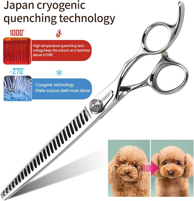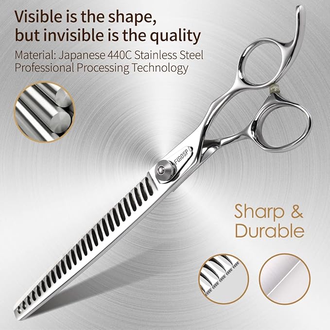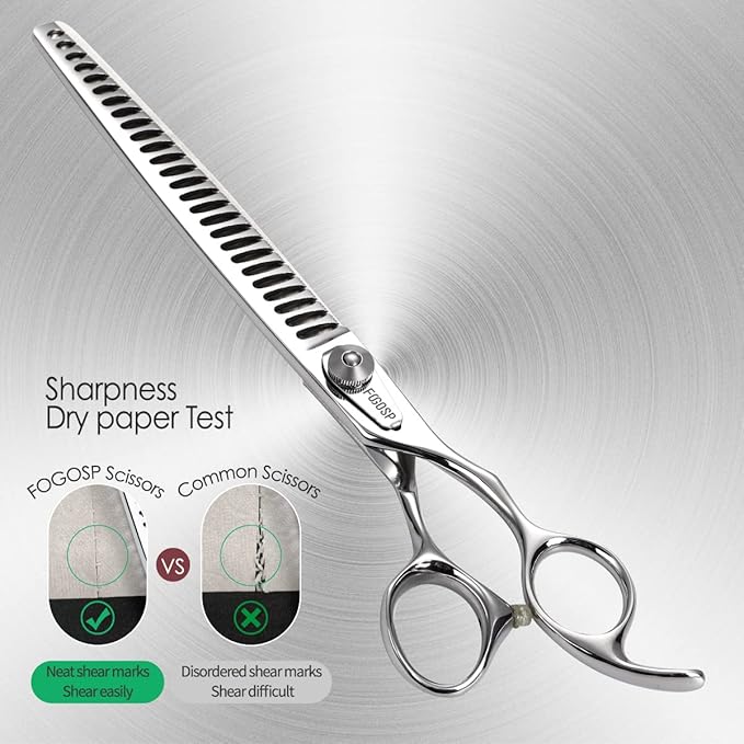 - π[Cost Effectiveness]The dog thinning shears for grooming are made of the most popular and comfortable pet grooming scissors molds in the US, and are polished by professional masters in accordance with the most rigorous production process. The semi-convex, micro serrated edge is designed to reduce slippage and enhance cutting performance. FOGOSP offer cost-effective professional dog grooming shears that pay tribute to the hard-working groomers who help keep pets healthy.