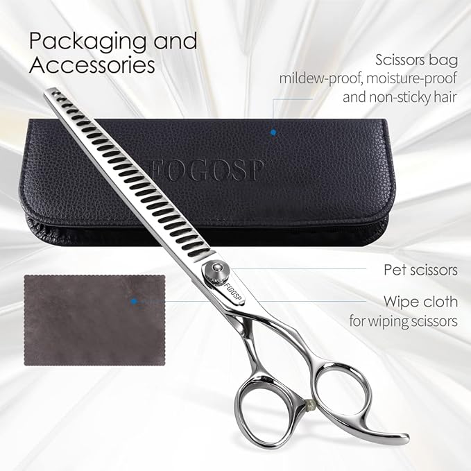 - π[Great Gift Idea] The dog thinning shears are ideal for pet hospital, pet salon, and home to use on teddy,poodle,cat and so on. The dog hair scissors for grooming is also definitely the perfect gift for relatives and friends, especially for dog or cat lovers. Personalized custom signature service to make your gift unique. FOGOSP dog grooming shears are the best gifts for Thanksgiving, Christmas, New Year, Birthday and other major days.