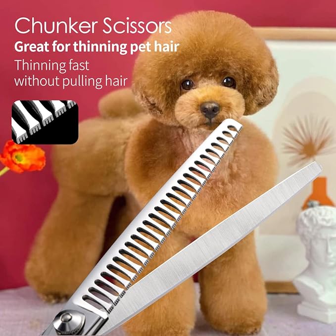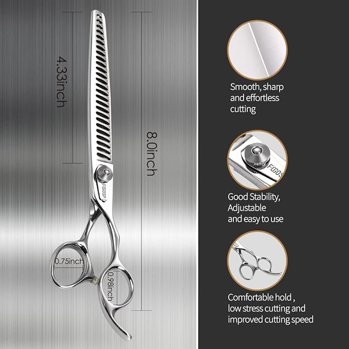 - π[Wide Application] The chunking shears for dog grooming which different from the traditional thinning scissors with 30% thinning, it's easier and faster for at-home DIY groomer, even it can instead of the straight scissors if you are not skilled on grooming. This 8 in right handed grooming shears for dogs cut thick long hair fast and accurately, make your work more efficient. If you would like to customize the scissors with your own signature, please contact us before placing your order.