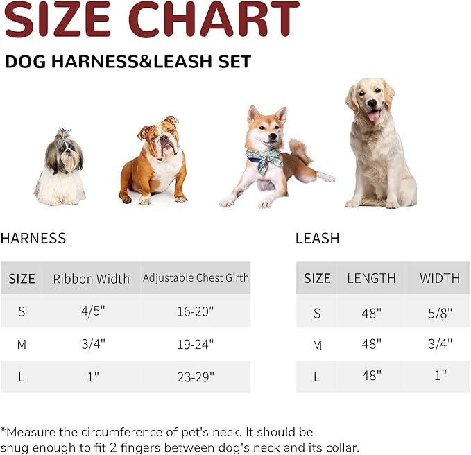 • [3 Sizes Option] No Pull dog harness and leash set are available in 3 sizes. Please measure your dog carefully according to the size chart before placing an order to ensure the collar fits your dog. Please leave room for your dog to rest, eat and chew
