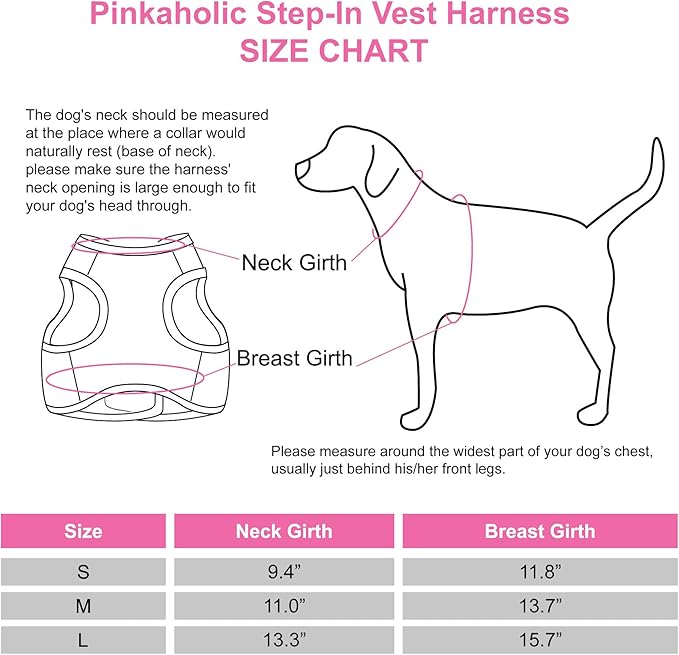 This size XXS harness is perfect for my small, 3-month-old puppy. The neck and chest measurements fit perfectly! It's easy to use, and the color is adorable. The padding is secure yet comfortable for him, and it's super easy to wash. I also bought the matching leash and love them both!