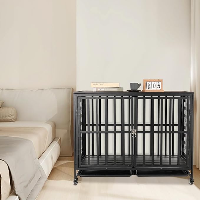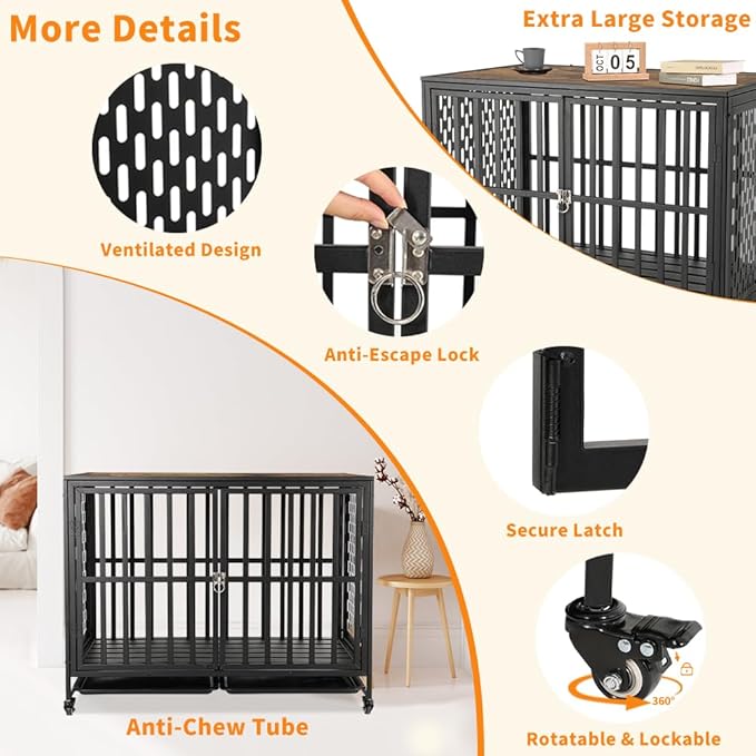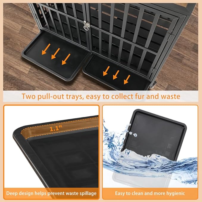 • Easy to Maintain and Move: The dog kennel indoor comes with 2 pull-out trays to collect dirt, washable and easy to clean. The front door makes it easy for pets to get in and out. The large dog crate equipped with 4 lockable 360-degree rotating wheels that allow you to easily move