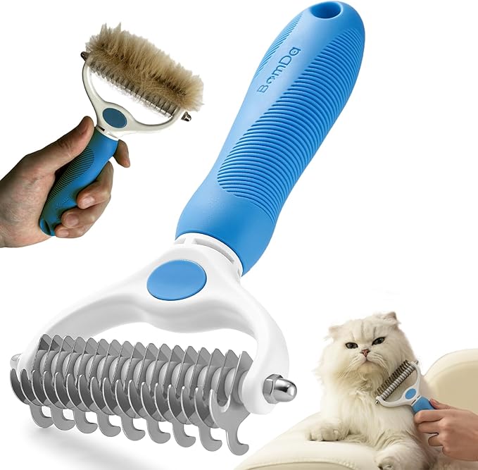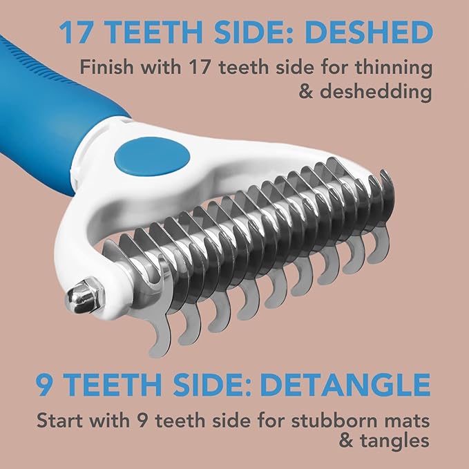 • DUAL SIDED DOG GROOMING BRUSH: The double sided undercoat rake for dogs & cats has a different number of teeth on each side. The lower density side is a dematting rake for stubborn mats and tangles. The higher density side is a detangler, deshedding tool, or undercoat rake for faster results thinning and to control shedding.