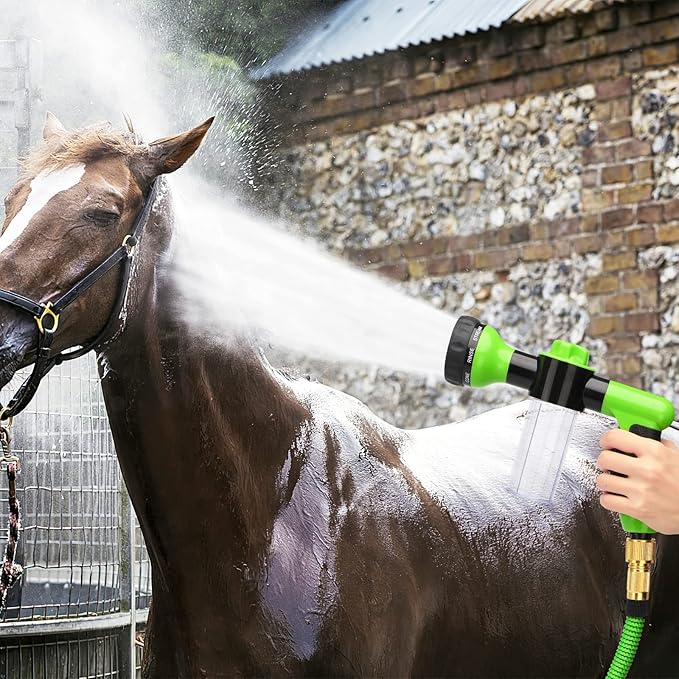 - 【Easy to Use】The expandable hose of the dog washing hose attachment kit is dedicated, and the connectors are all matching, use 1/2" and 3/4" connectors to easily connect the hose to the faucet. When using the horse wash sprayer, it can be turned on or off by simply pressing it, without having to keep pressing it (Note: Please refer to the main picture below and the description of the large picture of A+).