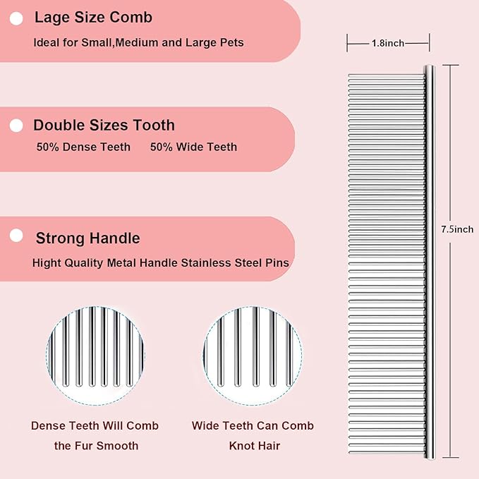 • 2 In 1 Stainless Steel Comb: Pet comb has high quality anti-static stainless steel round teeth that are strong enough, our dog combs for grooming features round teeth that break up tangles and effectively remove loose hair, dander dirt trapped beneath fur. dog comb naturally support the health of your furry best friend by boosting circulation