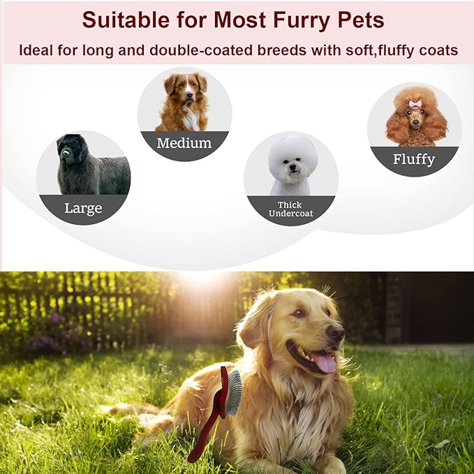 • Ergonomic Handle and Cushion Pad: The dog grooming brush features ultra firm wooden handle with a comfort-grip and anti-slip surface, prevents hand and wrist strain.This doodle brushes for grooming has a retractable cushion pad that protects your pet's skin from being scratched by the brush's pins.Our dog brush for long haired dogs spares you the time and expense of visiting pet groomers