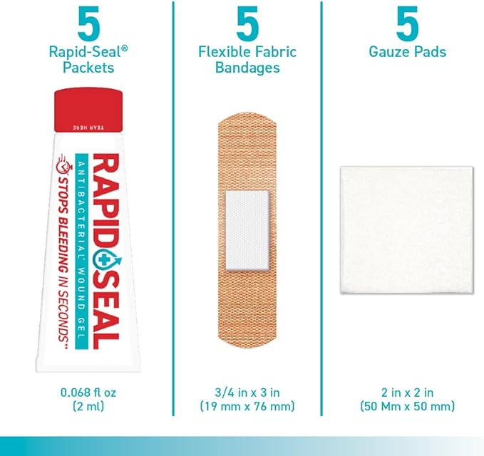 • With 15 pieces in total, the Rapid Seal wound care travel kit provides a comprehensive solution for stopping bleeding fast. The kit includes 5 sterile 2in x 2in gauze pads , 5 sterile 3/4in x 3in adhesive bandages, and 5 Rapid Seal Single use 2mL Gel packets. All of the items in the kit are compact and lightweight, making them easy to carry with you wherever you go.