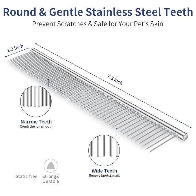 • [GENTLE & EFFECTIVE] Achieve gentle grooming and deshedding with a self cleaning slicker brush, rounded teeth rake, and comb. Soft bath head for tangle-free hair. Perfect for sensitive pets. Ergonomic design for comfort and control.