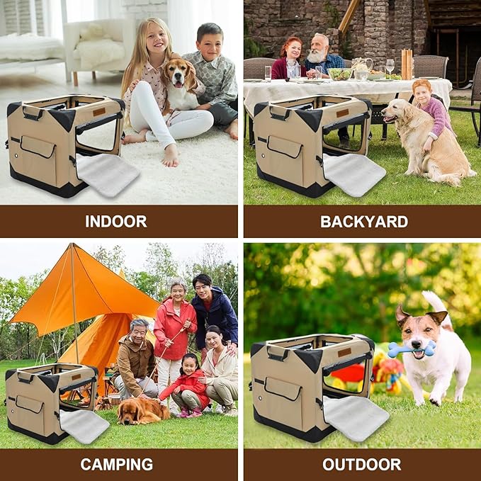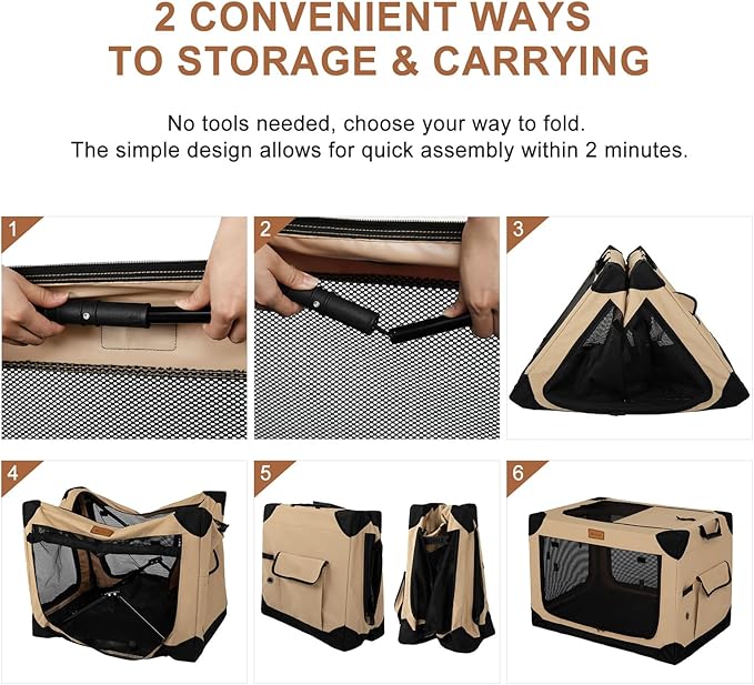 • Stable Structure: The foldable crate is made with a sturdy steel frame and high-quality waterproof Oxford fabric, ensuring that your pet is safe and secure while inside. The mesh windows allow for ventilation, while the zippered door makes it easy to access your pet.