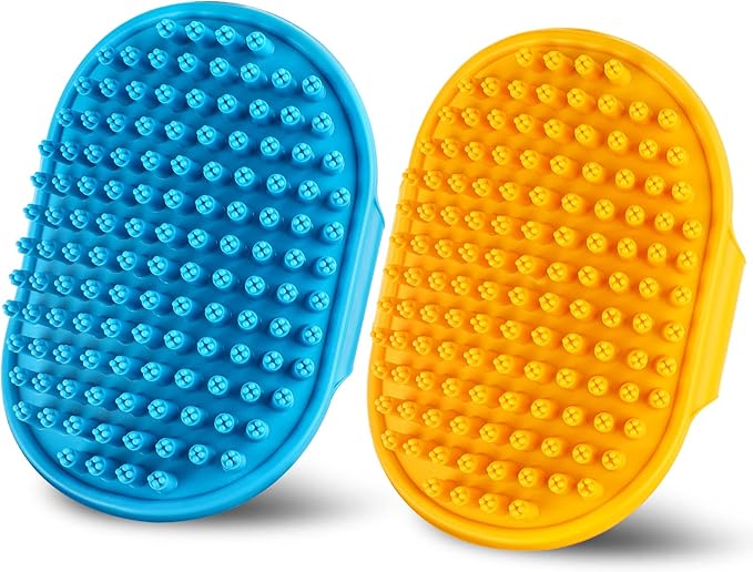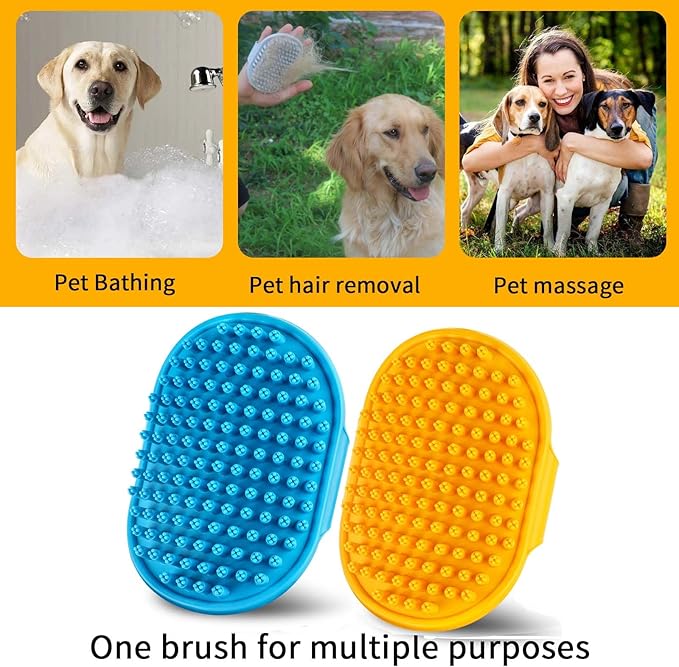 Dog Bath Brush | Dog Grooming Brush, Dog Shampoo Massage Bath Brush Comb with Adjustable Loop Handle for Grooming Short and Long Hair Cats and Dogs, 2pcs(Plum Brush Heads, Blue + Orange)