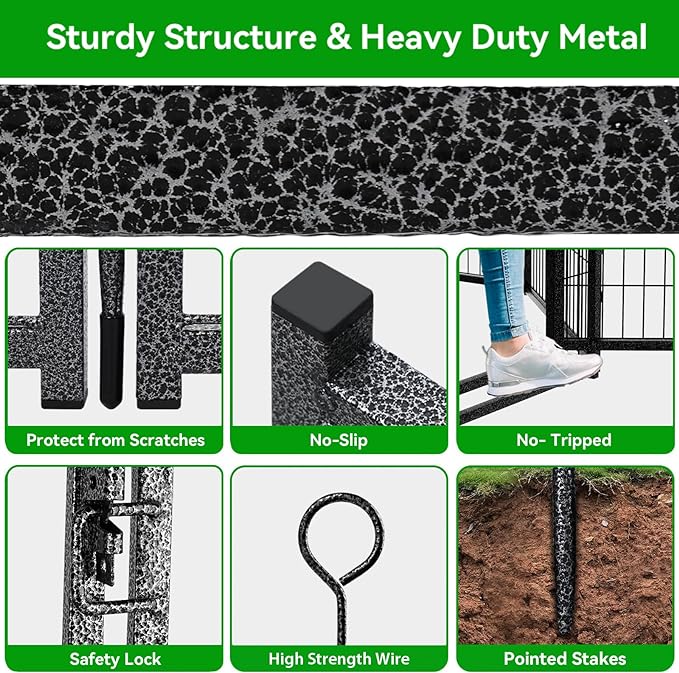 • 【Sturdy Structure & Stable Ground Stakes】Kfvigoho metal stakes are designed round top, which can be pounded into the ground for greater stability, this dog fence with sturdy structure, so dogs can't knock it down and keep them confined in a safe area, the pet pen works great for small, medium and large dogs and rabbits, ducks, turtles etc