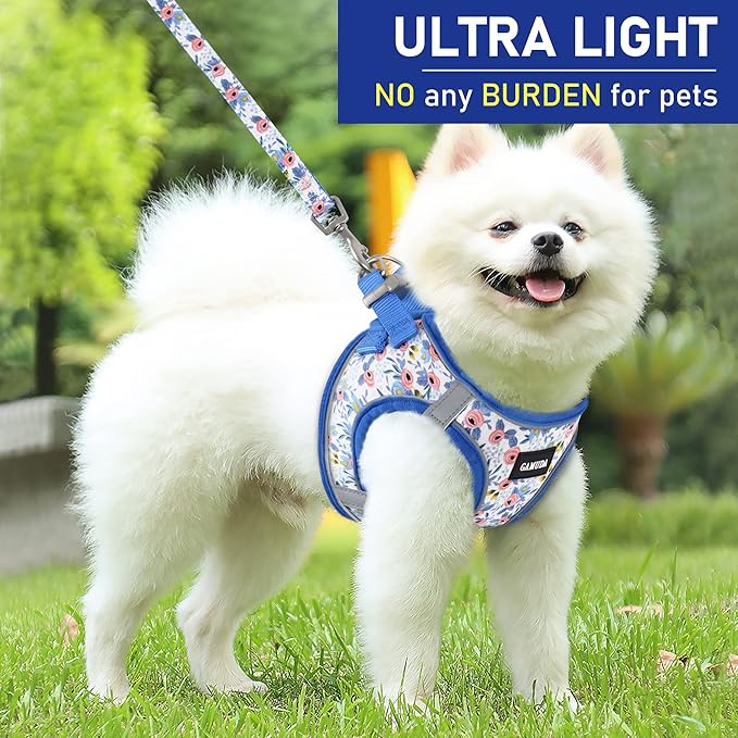 GAMUDA Small Dog Harness Collar and Leash Set, Step in No Chock No Pull Soft Mesh Adjustable Dog Vest Harnesses Plaid Reflective for Dogs Puppy Cats Kitten Rabbit (Blue Flower, XS)
