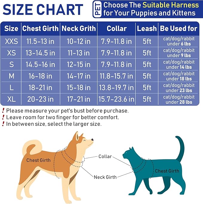 - SIZE CHART - [XXXS: Harness Chest 10"-12", Harness Neck 9"-11", Collar Length 7.9"-11.8"]; [XXS: Harness Chest 11.5"-13", Harness Neck 10"-12", Collar Length 7.9"-11.8"]; [XS: Harness Chest 13"-14.5", Harness Neck 11"-13", Collar Length 7.9"-11.8"]; [S: Harness Chest 14.5"-16", Harness Neck 12"-15", Collar Length 7.9"-11.8"]; [M: Harness Chest 16"-18", Harness Neck 14"-17", Collar Length 11.8"-15.7"]; [L: Harness Chest 18"-21", Harness Neck 15"-18", Collar Length 13.8"-19.7"]; [XL: Harness Chest 20"-23", Harness Neck 17"-21", Collar Length 15.7"-23.6"]. Please always measure your dog and refer to our brand size chart!
