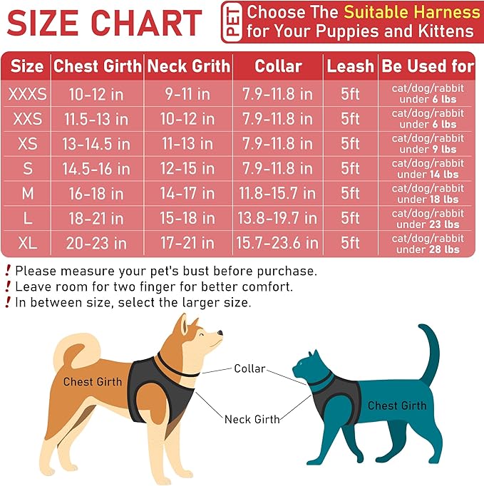 - SIZE CHART - [XXXS: Harness Chest 10"-12", Harness Neck 9"-11", Collar Length 7.9"-11.8"]; [XXS: Harness Chest 11.5"-13", Harness Neck 10"-12", Collar Length 7.9"-11.8"]; [XS: Harness Chest 13"-14.5", Harness Neck 11"-13", Collar Length 7.9"-11.8"]; [S: Harness Chest 14.5"-16", Harness Neck 12"-15", Collar Length 7.9"-11.8"]; [M: Harness Chest 16"-18", Harness Neck 14"-17", Collar Length 11.8"-15.7"]; [L: Harness Chest 18"-21", Harness Neck 15"-18", Collar Length 13.8"-19.7"]; [XL: Harness Chest 20"-23", Harness Neck 17"-21", Collar Length 15.7"-23.6"]. Please always measure your dog and refer to our brand size chart!