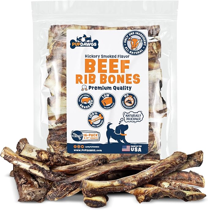Single Ingredient Dog Bones - Made in USA – 8-10” Beef Rib Bones - Natural Dog Bones for Aggressive Chewers - from USDA Inspected Beef - Hickory Smoked - Individually Wrapped (16 Piece Pack)
