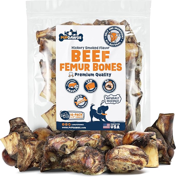 Single Ingredient Dog Bones - Made in USA - Beef Femur Bones - Natural Dog Bones for Aggressive Chewers - from USDA Inspected Beef - Hickory Smoked - Individually Wrapped (16 Piece Pack)