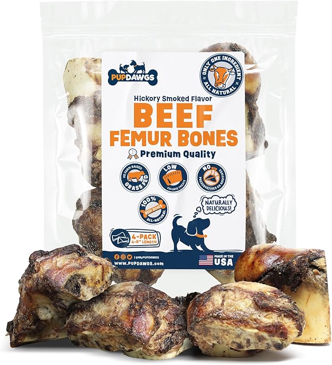 Single Ingredient Dog Bones - Made in USA - Beef Femur Bones - Natural Dog Bones for Aggressive Chewers - from USDA Inspected Beef - Hickory Smoked - Individually Wrapped (4 Piece Pack)