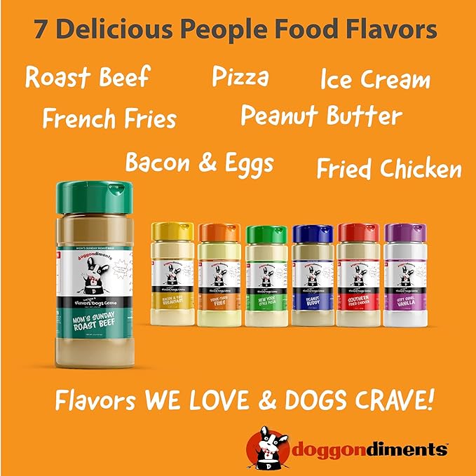 • ✅ WORKS GREAT WITH ANY TYPE OF FOOD - Doggondiments dog food toppers are perfect for dry kibble, wet can food - even fresh veggies. The perfect way to jazz up a boring Tuesday night meal for your dog.