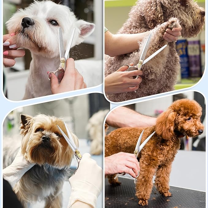 • Sharp Dog Scissors -- With razor-sharp blades and a smooth cutting action, our 7.5" scissors ensure precision haircuts without compromising on safety. These dog groooming scissors set adopt quality steel and precise adjust screw,which makes the dog scissors sharp and solid. You don't need to worry about misalign or cathing your dogs' fur.