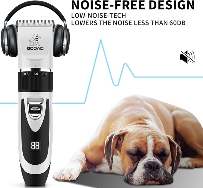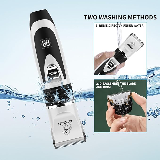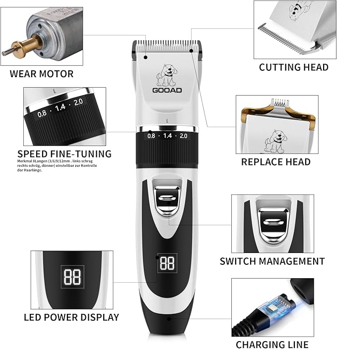 • Long Lasting Battery & LED Indication: 2200mA High Capacity Li-ion Battery, charging for 3 hours and can sustain use of 250 minutes.With LCD display,for reminding using and charging status,helping you better control the grooming work.Rechargeable design of this dog clipper, you don't have to buy replace batteries.