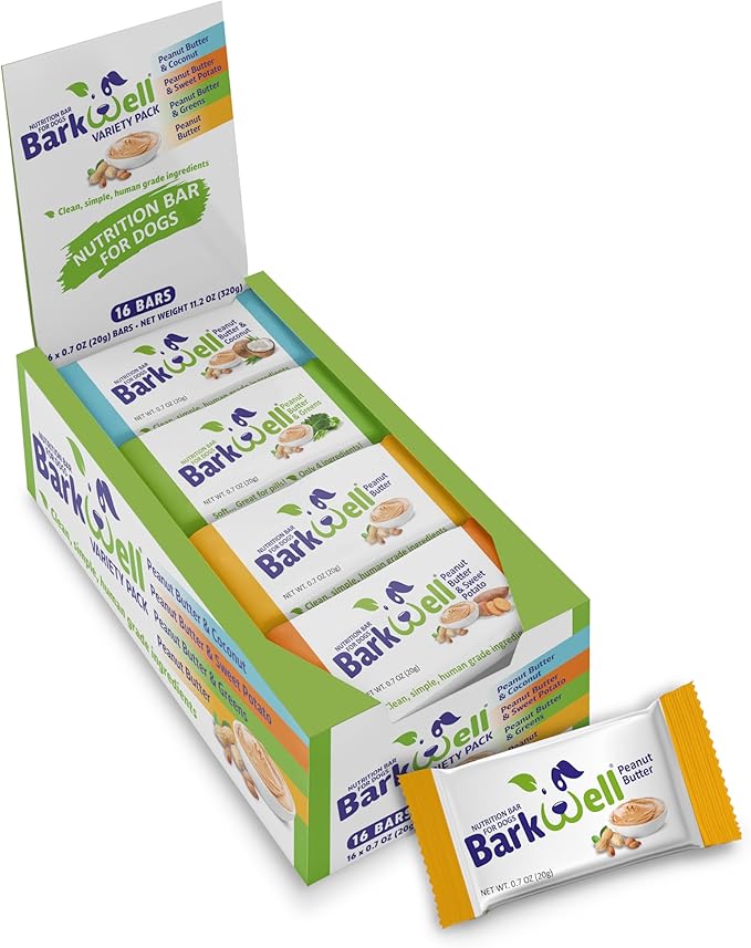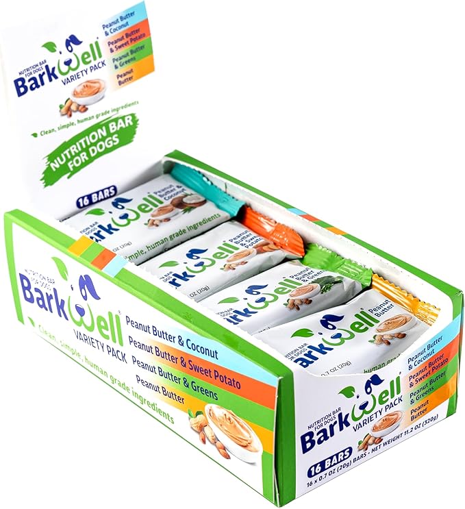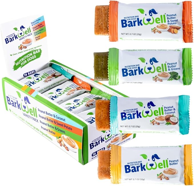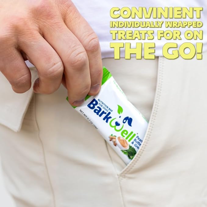 • HEALTHY DOG TREATS FOR ALL AGES - BarkWell Protein Bars are healthy dog treats perfect for dogs and puppies of all ages. Each 0.7-ounce bar is packed with essential nutrients and protein, making them ideal doggie treats for your furry friend. Our natural dog treats are free from harmful additives, ensuring your pet gets only the best from their treats