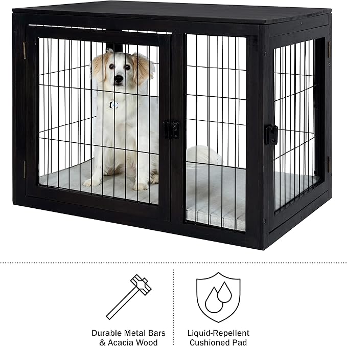 • DURABLE - This pet crate is made of metal enclosure bars and durable acacia wood to ensure this dog crate table looks great for years to come. The liquid-repellent fabric on the included cushioned pad allows for a mess-free cleanup.