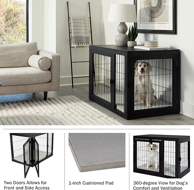 • COMFORTABLE DESIGN - The wood dog crate is equipped with two doors, allowing for front and side access, a 1-inch cushioned pad that is removable for easy cleaning, and a 360-degree open view so your dog can see you and get plenty of ventilation.