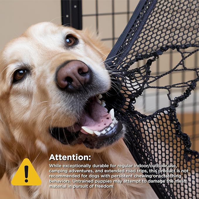 • Enhanced Safety: With a heavy-duty iron frame, this crate maintains its shape and ensures durability. Reflective strips on both sides enhance visibility, keeping your pet safe and visible. The crate is equipped with self-locking zippers, preventing your pet from escaping, while high-density durable mesh adds an extra layer of security. Additionally, an built-in leash further reinforces your pet's safety.