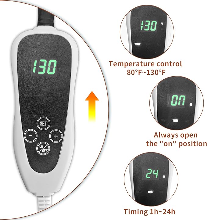 • Intelligent Thermostat: Adjustable temperature 80°F~130°F, the opening time between 1 hour~24 hours is freely adjustable, new normally open function "on" gear. Please note that turn off the pet heating pad promptly after use