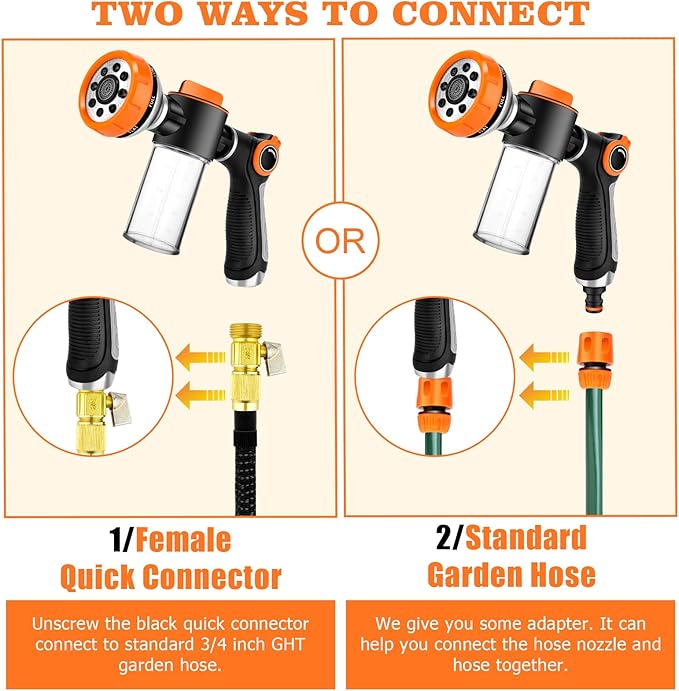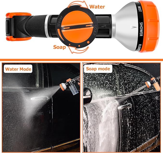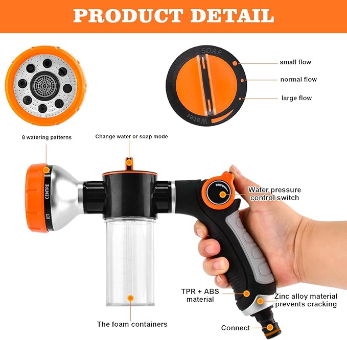 • Ergonomic Design: Easily thumbwheel switch, it only needs a slight push by the thumb to start work and adjust the water output. The soap on/off would help you to switch the soap mode and water mode, and control the dilution of foam; Rotate the head of hose sprinkle, and switch the water spray mode.