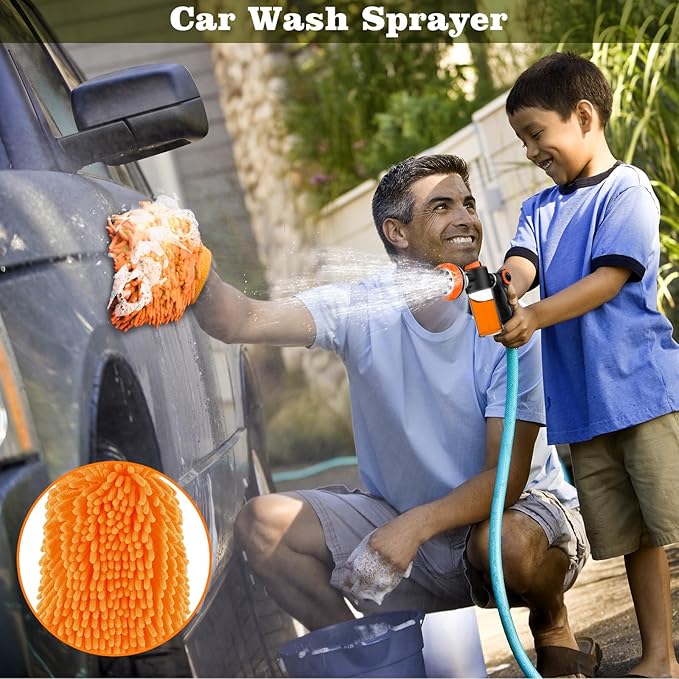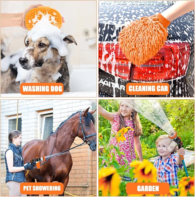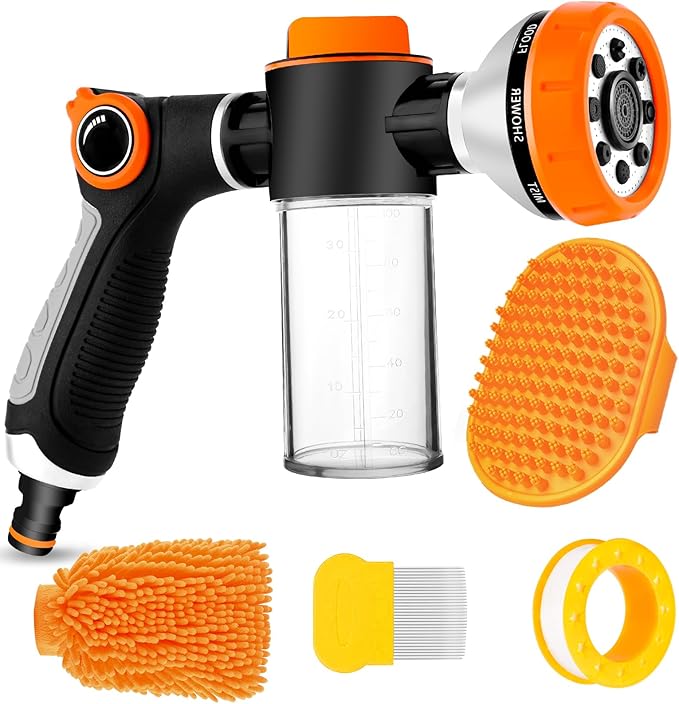 • Practical accessories: Extra dogs and cats tear stain remover grooming comb and pet rubber bathing comb brush. A nice set for giving your pet a bath. It's also a partical car wash hose attachment. Package includes 1 * hose nozzle, 1 * hose connector, 1 *washing mitt for car wash, 1 * pet grooming comb, 1 * pet bath brush, and 1 * PTFE Sealant Tape.