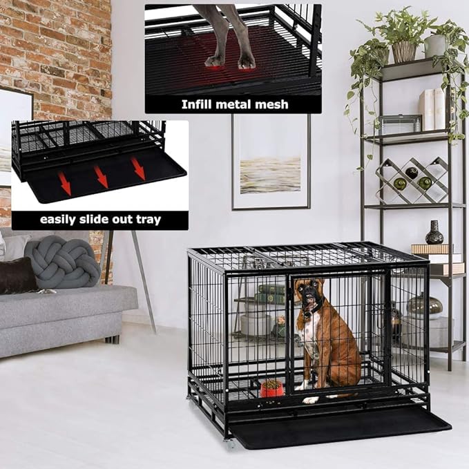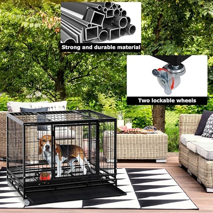 • ▲【LOCKABLE WHEELS】Our dog cage includes four rolling casters (two lockable) for easy transfer from room to room. Two wheels have locks to prevent accidental movement and keep your dog crate securely in place. The dog dog kennel provides a secure and convenient use in your daily life.dog kennel dog crate dog cage