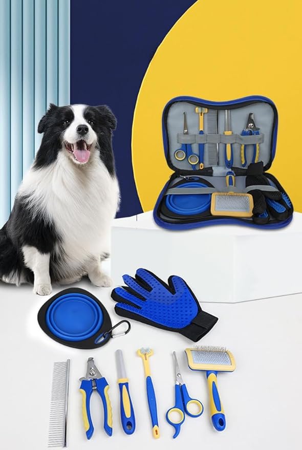 TSINGS Pet Grooming Tools 8-Piece Kit with Hair Comb, Steel Comb, Nail Clipper, File, Hair Clipper, Toothbrush, Bowl and Hair Removal Gloves