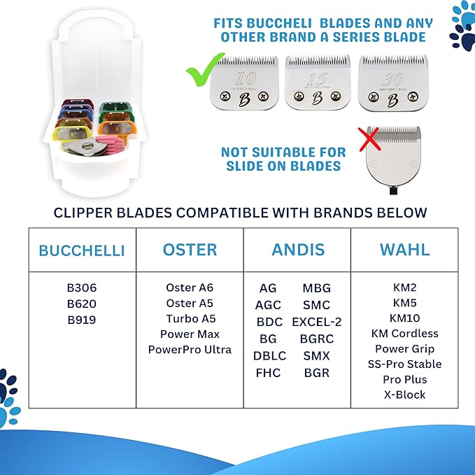 • DIVERSE COMPATIBILITY: The pet clipper comb attachment guard is compatible with Bucchelli, Andis, Conair, Wahl, Laube, Thrive, or other A5 type pet grooming clippers. The comb replacement is ideal for pet hair barbers/stylists.