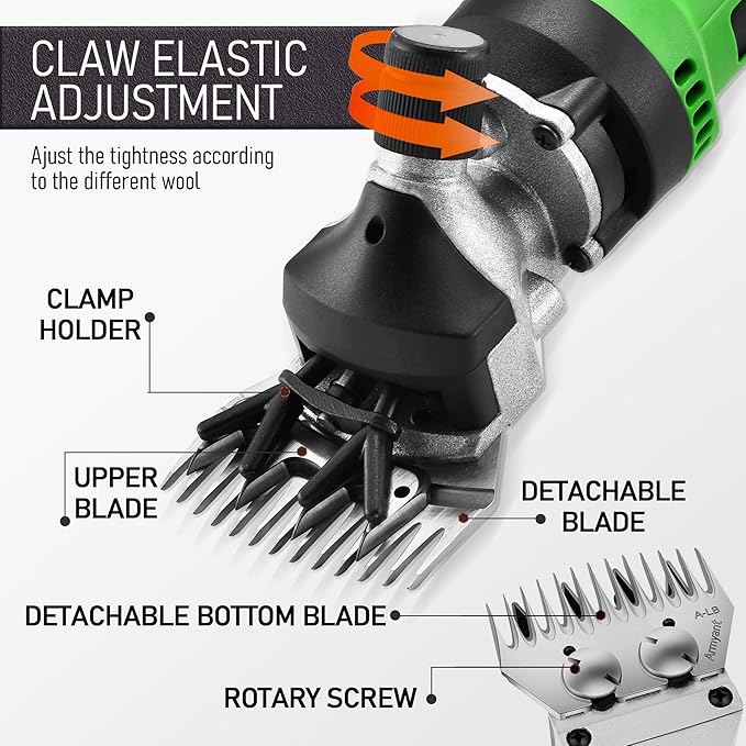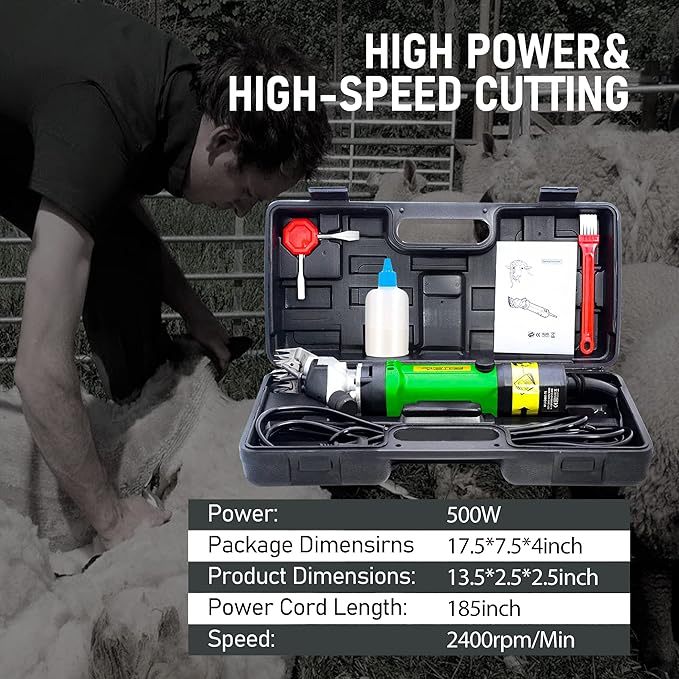 • 【LIGHT & PORTABLE】:This premium sheep shears kit includes our dual-blade electric grooming clippers with the head, clipper screwdriver, one cleaning brush, a 5.6m power cord, a bottle of oil, 2 sets of carbon brushes, plus a convenient carrying case.1