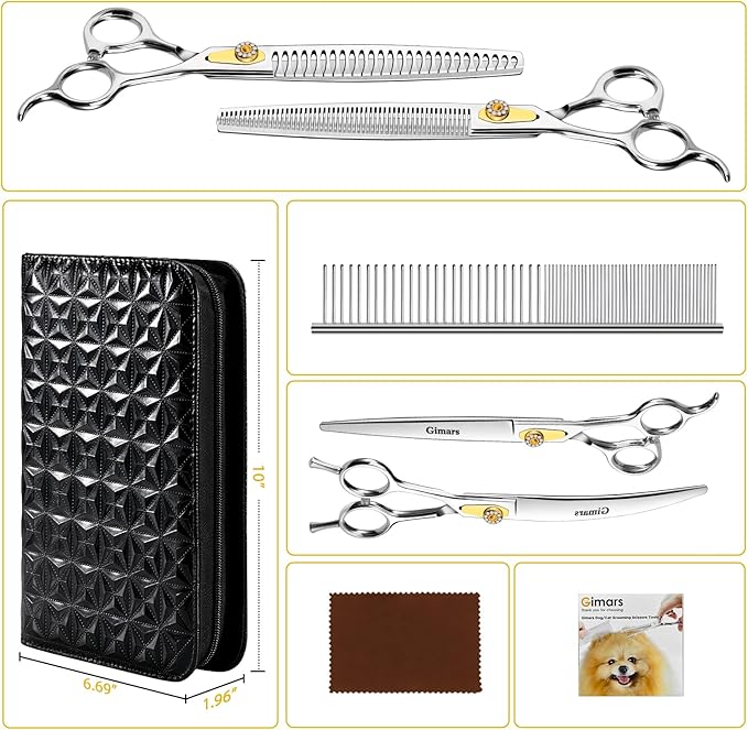 Gimars 8 Inch Professional 440C Stainless Steel Dog Grooming Scissors Heavy Duty 6 In 1 - Straight, Thinning, Chunker, Curved Shears and Comb, Ergonomic Pet Grooming Scissor for Dogs, Cats