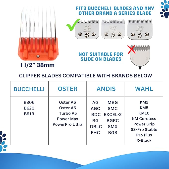 • PRODUCT SPECIFICATIONS: The stainless-steel guide attachment comb offers 1 1/2 inches or 38 mm haircut length. It is ideal for Bucchelli and other similar A5 type blades.