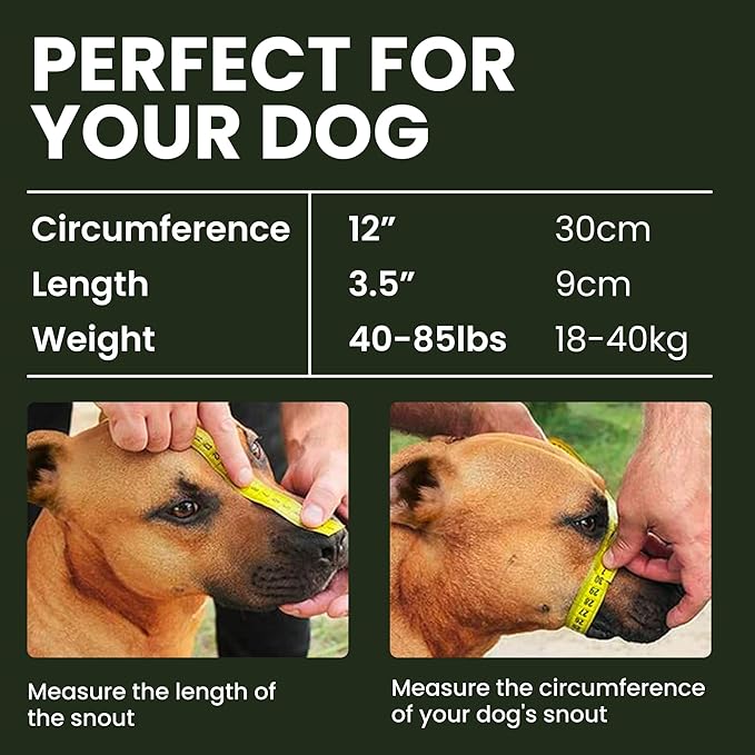 • Pitbull dog muzzle size: Girth of dog's snout is 12 inches, length of dog's snout is 3 1/2 inches. Please follow measuring tips in our VIDEO. Measure your dog`s snout before purchasing.