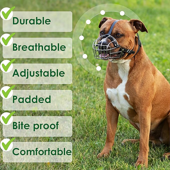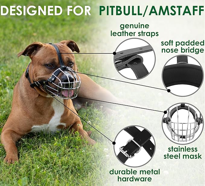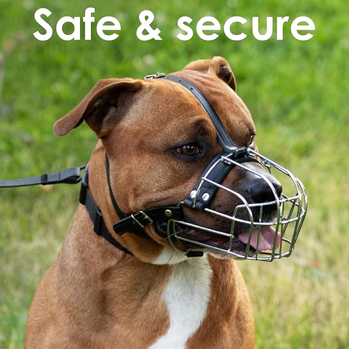 • This dog muzzle for pitbulls allows plenty of air in, which is necessary for your pets comfort and wellbeing. Comfortable shape basket dog muzzle allows unrestricted nose licking. Steel dog muzzle provides a secure and humane way to control your furry friend's behavior during walks, training sessions, visits to the vet, grooming and etc.
