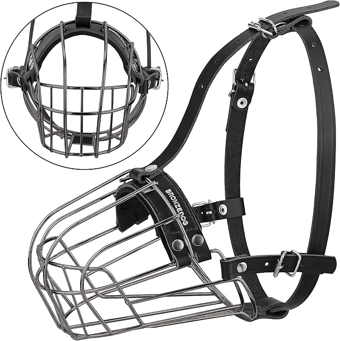 BRONZEDOG Pitbull Dog Muzzle Metal Mask Amstaff Wire Basket Pit Bull Adjustable Leather Straps for Large Dogs (Graphite Metal)