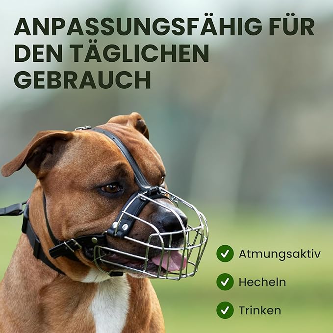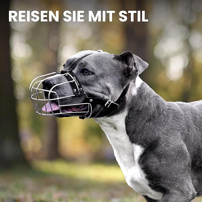• This dog muzzle for pitbulls allows plenty of air in, which is necessary for your pets comfort and wellbeing. Comfortable shape basket dog muzzle allows unrestricted nose licking. Steel dog muzzle provides a secure and humane way to control your furry friend's behavior during walks, training sessions, visits to the vet, grooming and etc.