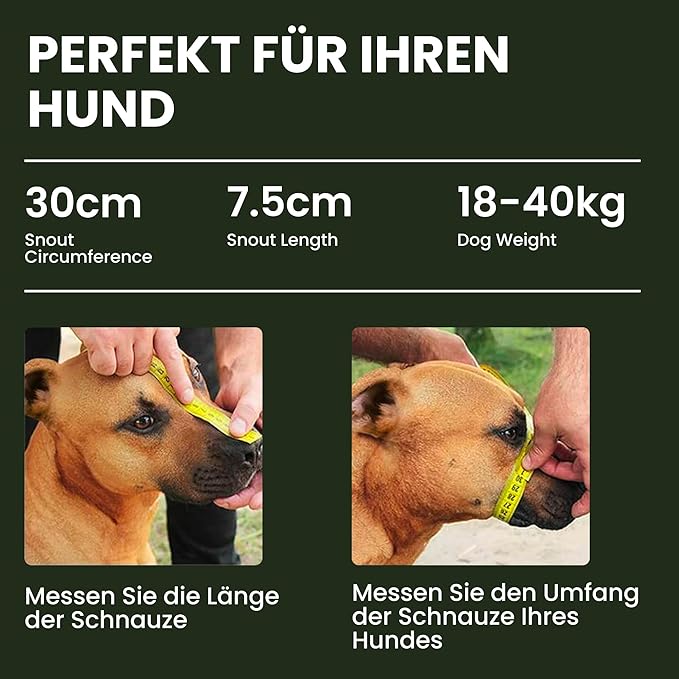 • Pitbull dog muzzle size: Girth of dog's snout is 12 inches, length of dog's snout is 3 1/2 inches. Please follow measuring tips in our VIDEO. Measure your dog`s snout before purchasing.