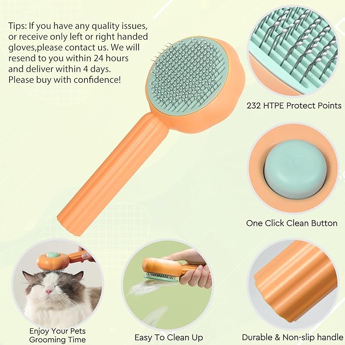 • One click Cleaning Button and Non slip Handle:You just have to Simply click the button,and the pet hair will be pushed out of the brush;The non slip rubber and ergonomic handle includes a silicone, slip resistant grip that is comfortable to use;It is more convenient and efficient to use
