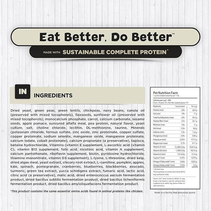 • SUSTAINABLE COMPLETE PROTEIN – Our primary source of protein is a plant-based, dry yeast that provides all essential amino acids and nutrients, similar to animal proteins found in chicken, making it a top choice for vegan dog food and dry dog food options. This eco-friendly protein emits significantly less CO2 than traditional meat sources, supporting a more sustainable, plant-based diet for dogs.