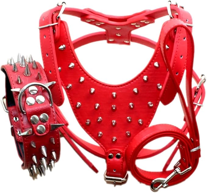 Leather Spiked Studded Harnesses, Collars & Leashes 3Pcs Matching Set for Medium & Large Dogs Pitbull,Mastiff, Boxer, Bull Terrier (Red1, M)