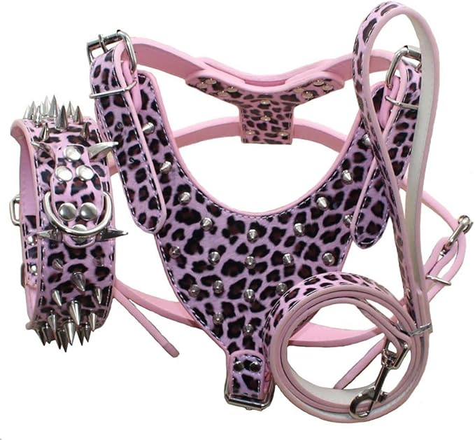 Leather Spiked Studded Harnesses, Collars & Leashes 3Pcs Matching Set for Medium & Large Dogs Pitbull,Mastiff, Boxer, Bull Terrier (Leopard1, L)