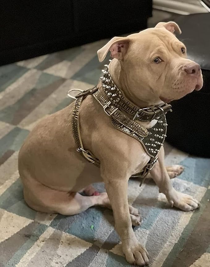 Leather Spiked Studded Harnesses, Collars & Leashes 3Pcs Matching Set for Medium & Large Dogs Pitbull,Mastiff, Boxer, Bull Terrier (Gold Brown, L)