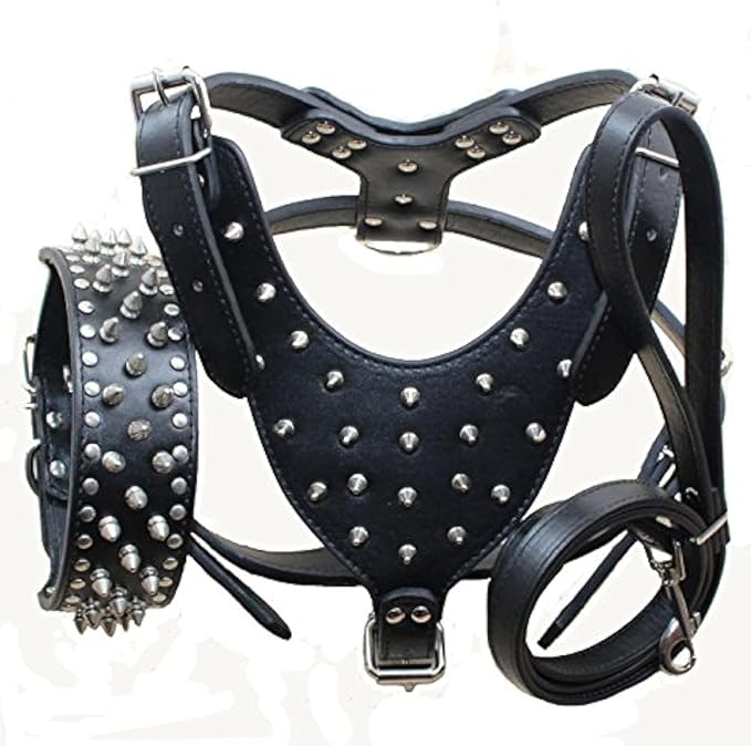 Leather Spiked Studded Harnesses, Collars & Leashes 3Pcs Matching Set for Medium & Large Dogs Pitbull,Mastiff, Boxer, Bull Terrier (Black, L)
