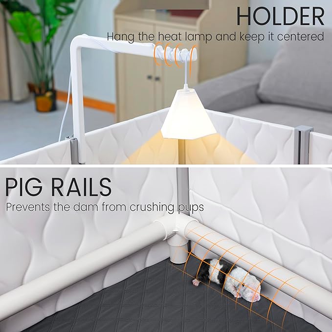 • Optimal Safety for Your Pups: Premium PP and HDPE materials used in injection molding - sturdy and tightly connected without gaps; each wall weighs 4 lbs, providing enough weight to make it effectively self-supporting and prevent movement even when a dog leans against it; the pig rail prevents the dam from crushing pups that may get stuck between her body and the edges of the box. All are designed for absolute safety, so you can really relax without worrying about your new-born pups.