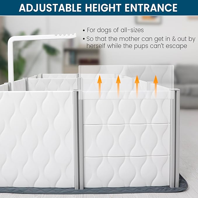 • Optimal Safety for Your Pups: Premium PP and HDPE materials used in injection molding - sturdy and tightly connected without gaps; each wall weighs 4 lbs, providing enough weight to make it effectively self-supporting and prevent movement even when a dog leans against it; the pig rail prevents the dam from crushing pups that may get stuck between her body and the edges of the box. All are designed for absolute safety, so you can really relax without worrying about your new-born pups.